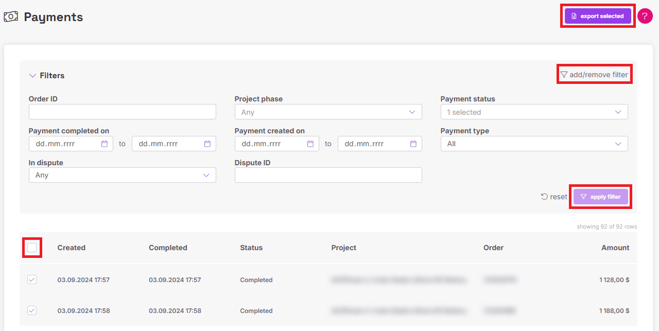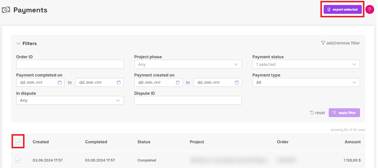 If you need to export only a certain group of payments, click "Filters" and, depending on your needs, choose the filtering options. To add more filtering based on when the payment was created, click "add/remove filter". Remember to click "apply filter" when you're done. Click the box to check all filtered orders you want to export and click "export selected" in the top right corner: