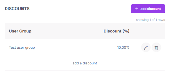 On the right, there is a field where you can manage group discounts. Click "+ Add discount" to define the discount value and choose to which group it should be applied: