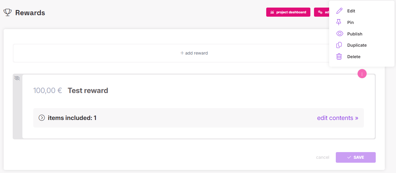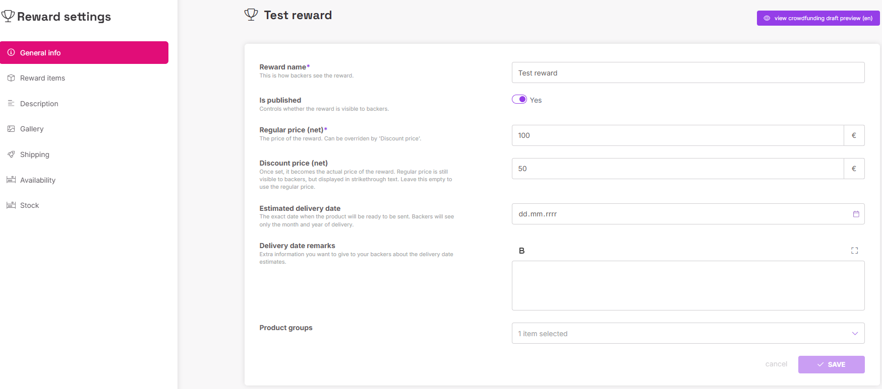 Is published - This field defines whether the reward is visible on the project page (note: when the project is in the preview stage, as long as the rewards section is not published in the detailed description, the reward will not be visible even if "Is published" is enabled).
