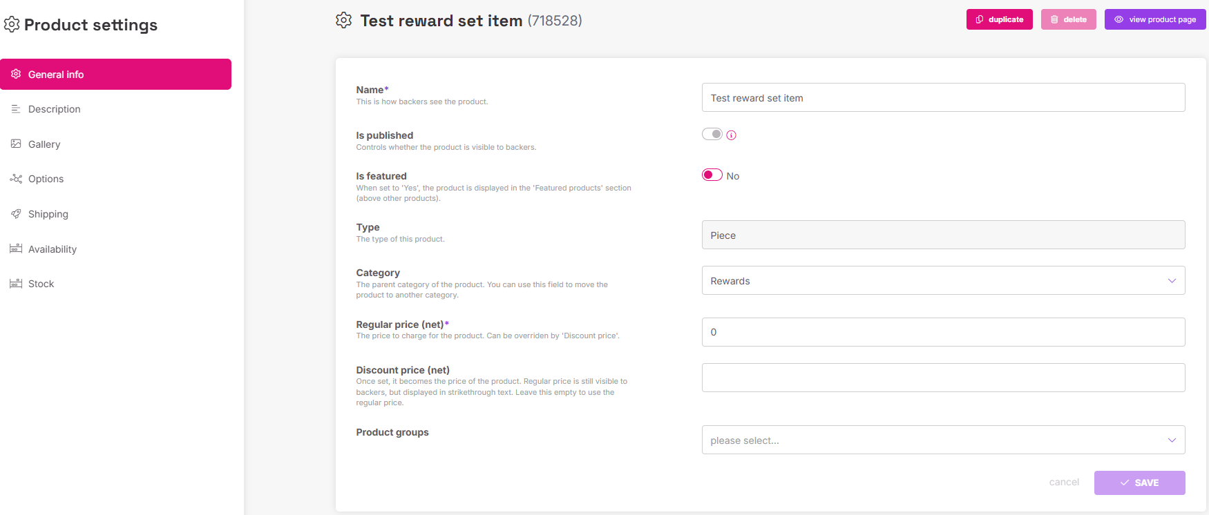 Product is buyable - Determines whether a product can be purchased. Switch this to 'No' if you don't want your backers to ever buy this product or if you only want it to be available as a part of a set. Please note that for reward sets, the option is always locked to "Yes."