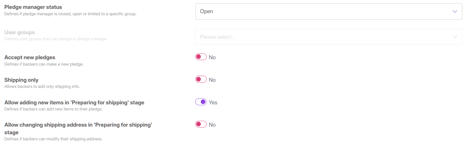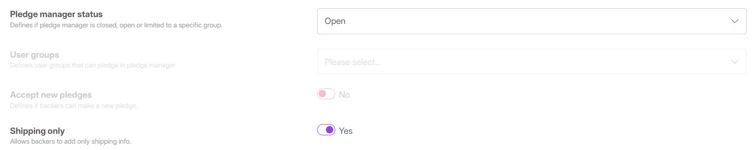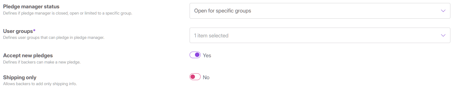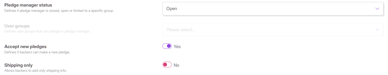 - Open for Specific Groups: You can restrict access to only specific groups of backers that you define. This allows you to open the pledge manager for select backers while it remains closed to the public.