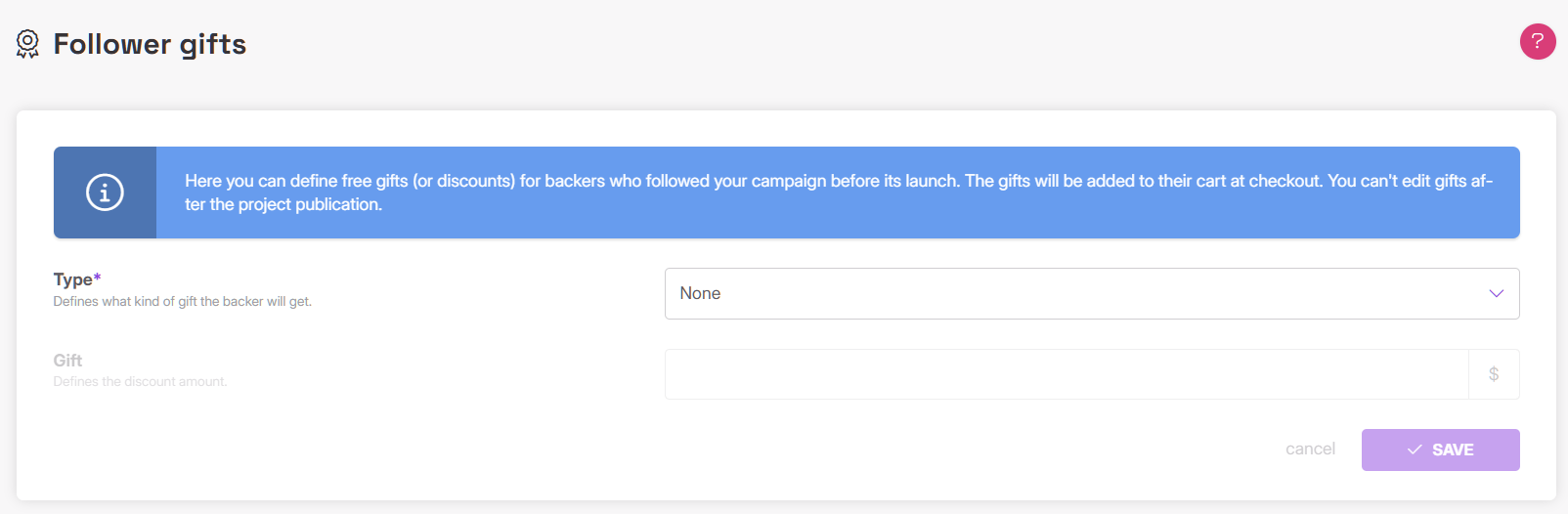 The follower gift is a specialized feature designed to encourage potential backers to start following your project before it officially launches. Leveraging this feature during the draft stage is essential for building an engaged audience prior to the crowdfunding period.