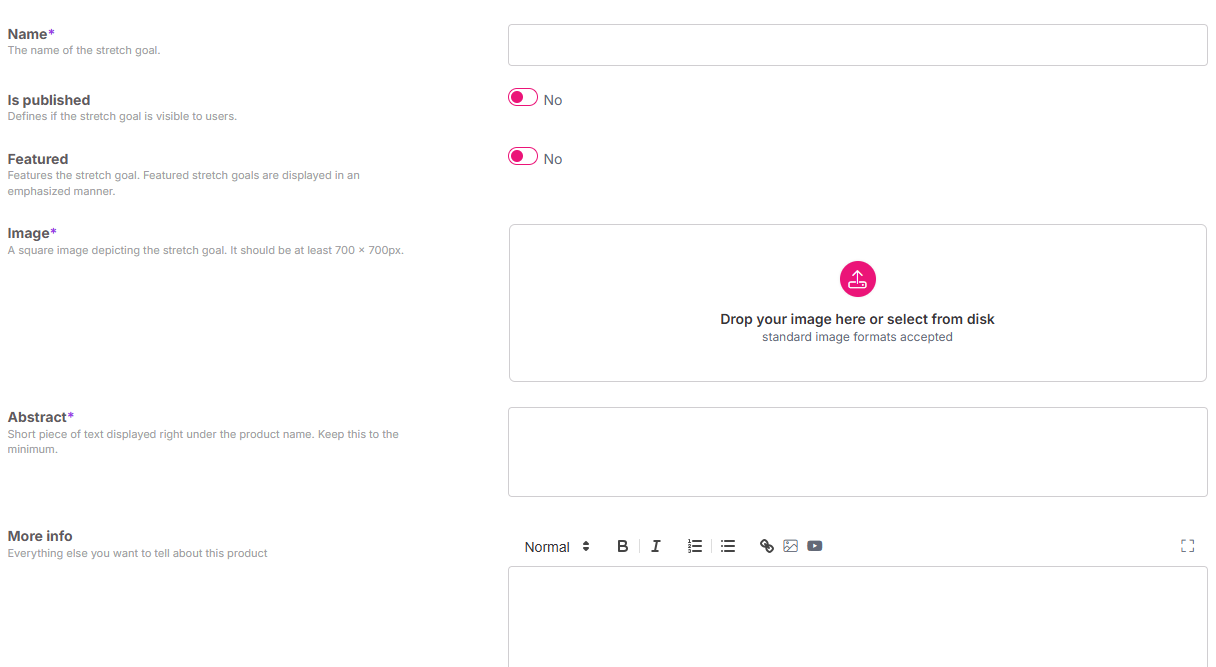 Each stretch goal must have a name. Here you can also publish or unpublish the stretch goal (unpublishing is possible until the end of the crowdfunding) and define if it's featured or not. Then, you'll need to add an image and description for the goal. You can also add more information if you want.