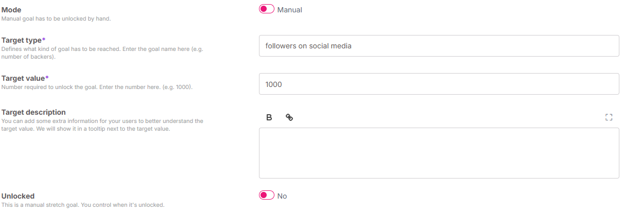 To add a manual stretch goal, change the toggle position to manual. Then, define the "Target type". You can enter anything here that is not defined by the automatic goals, such as the number of followers on social media.
