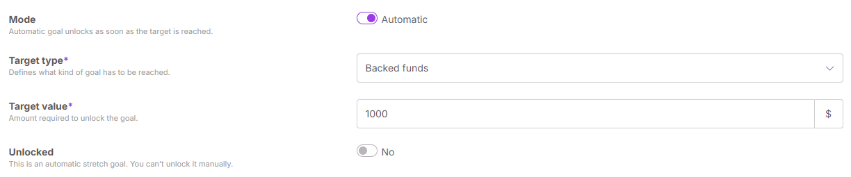 To add an automatic goal, change the toggle position to automatic. Then, choose the target type from a dropdown menu: backers count, backed funds, or campaign day. Each target has a different value. You can define it below the type. For example, if you want the stretch goal to be unlocked after collecting $10,000, choose "backed funds" and enter "10000" in the target value. If you want it to unlock on the 3rd day of the campaign, choose "campaign day" and enter "3" in the target value field, etc.