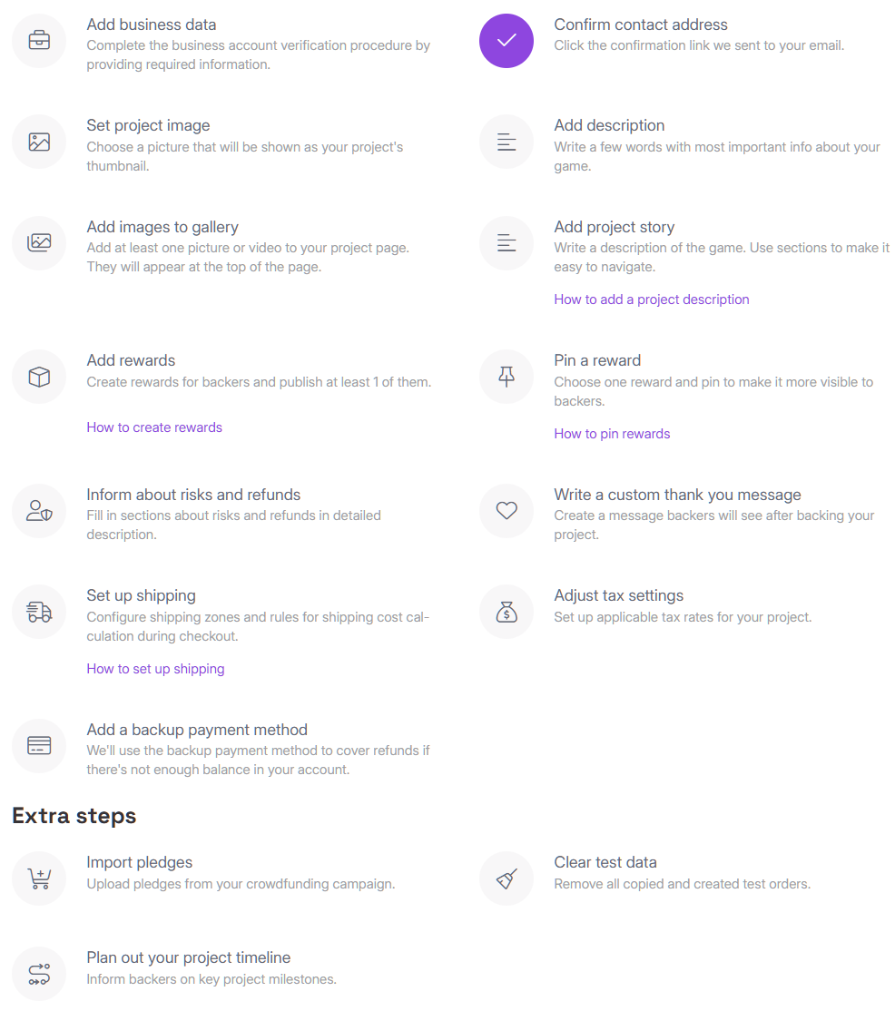 Once you have decided whether you want to open a late pledge or pledge manager, you can start setting up the project page. Our project dashboard will tell you what you need to do: