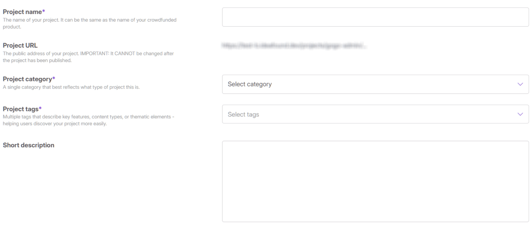 Add the project name and select the URL. The URL is set by default, but you can change it before the project preview goes live. Next, choose project categories and include a short description.