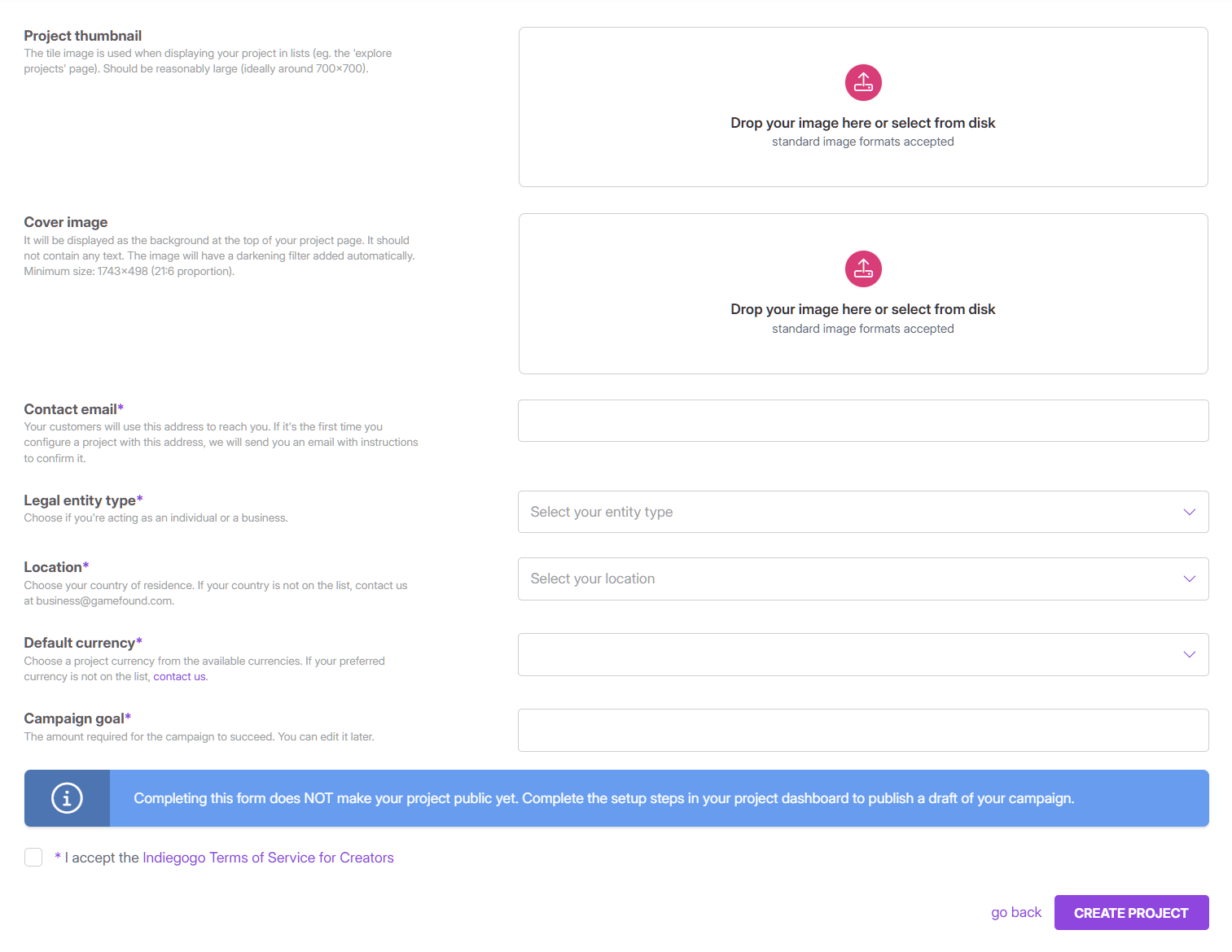 Then, you can add a thumbnail and cover image for your project. Include your contact email, define your legal entity type, and location. After that, you'll be able to choose the currency based on your country. Enter the minimum amount of money you want your campaign to collect in the campaign goal. Finally, read and accept Terms of Service for Creators and click "Create project" - you will be directed to the project dashboard to start setting up a preview page.