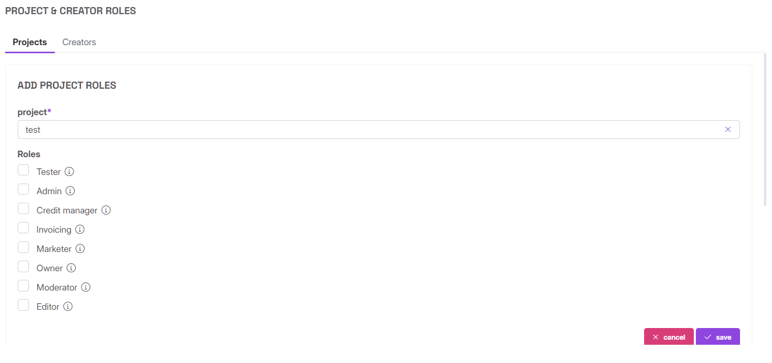 NOTE: Creator roles will give access to all projects of this creator, while project roles will give access only to a specific project.