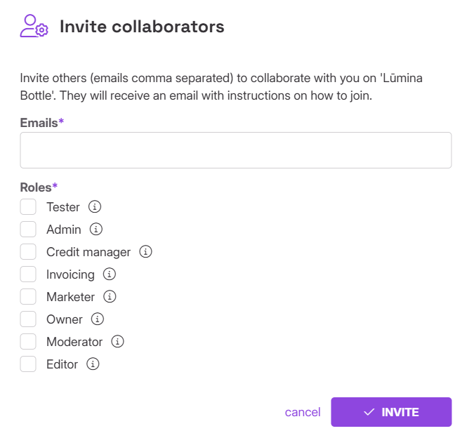 As a project creator you can invite a user to become a collaborator in a project by going to Users -> User list, clicking "Invite collaborators" and entering an email. You can choose the roles for this user from a list: