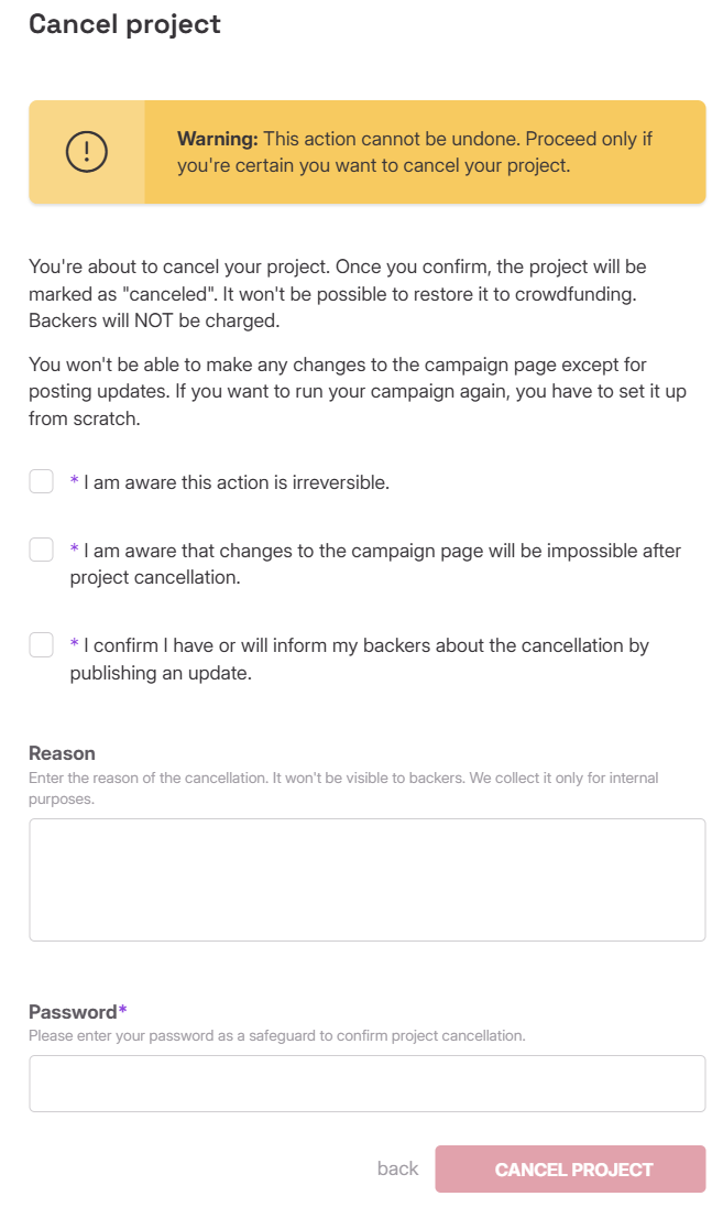 If your project has already started the crowdfunding phase, go to "Project" -> "Settings" and once the General settings open, click the three-dot button and select "Cancel project". You'll see the following window with details concerning canceling: