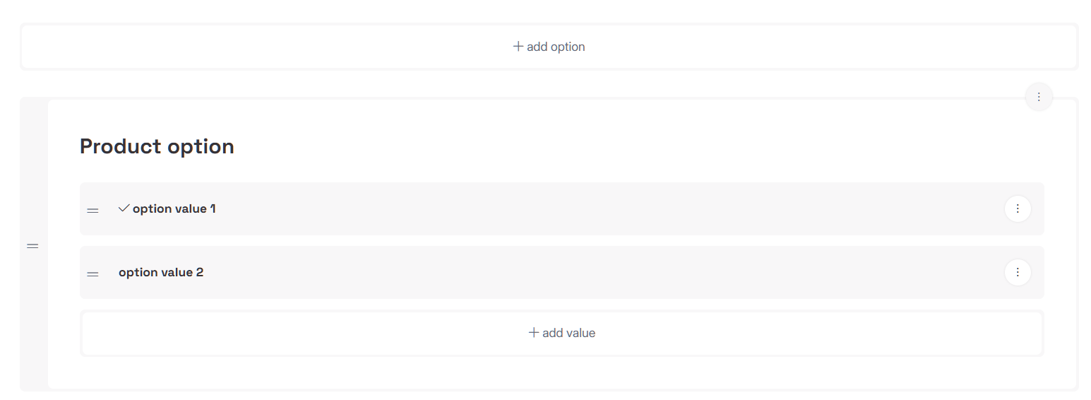 Here you can add product options. Click "+ add option" to add a new product option. Click the three-dot button to see the menu. If you have a few options, you can drag and drop to change positions or use the menu to move their positions up or down.