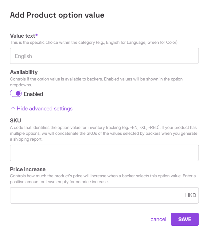 NOTE: It's impossible to remove an option or value if a backer added it to a pledge.
