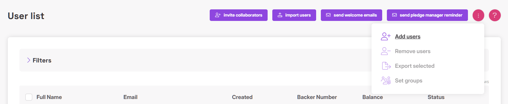 You can invite users to your campaign by adding them directly through email. To do that, go to Users -> User list, click the three-dot icon, and then click the "Add users" button.