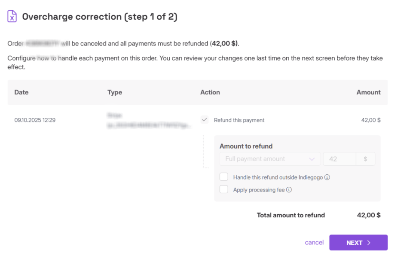 You can see the order ID, overcharged amount, the amount that will be refunded, order date, and type of payment. If you don't want to initiate an automatic refund using the payment provider used by the backer, select "Handle this refund outside Indiegogo". The payment will not be reversed automatically; you will have to do it manually, for example using PayPal or a bank transfer.