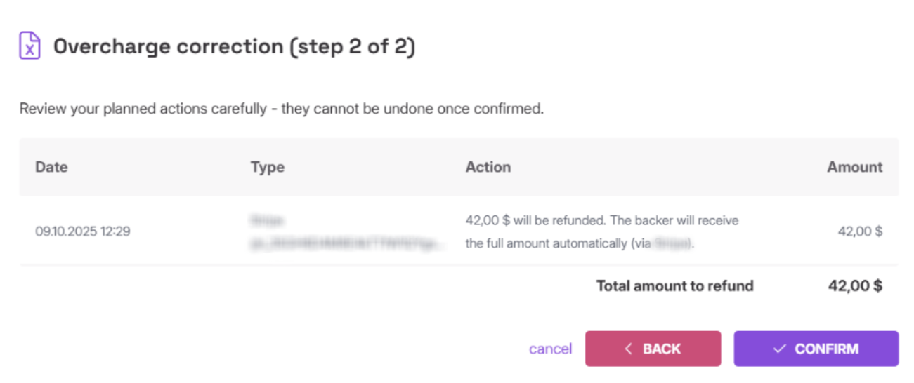After you set up refund details, click "Next". You will see a summary of the refund, including the transaction fee amount (if applied). Click "Confirm" to confirm the refund and order cancellation or "Back" if you want to change the refund details:
