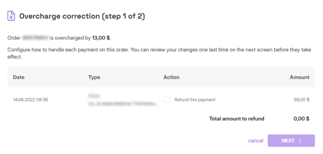 After saving the changes, click "Correct overcharge" that appears at the top of the page:
