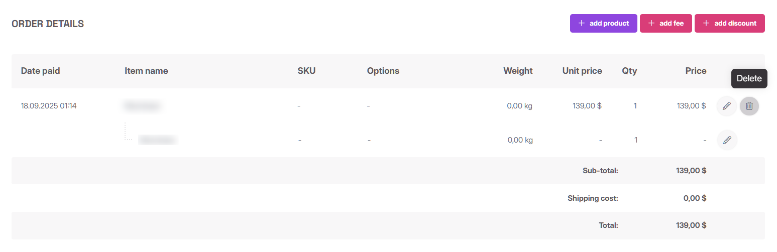 To refund only a portion of a pledge, locate the order for which you need to process a refund, click Edit order, and remove the item that requires a refund from the order details: