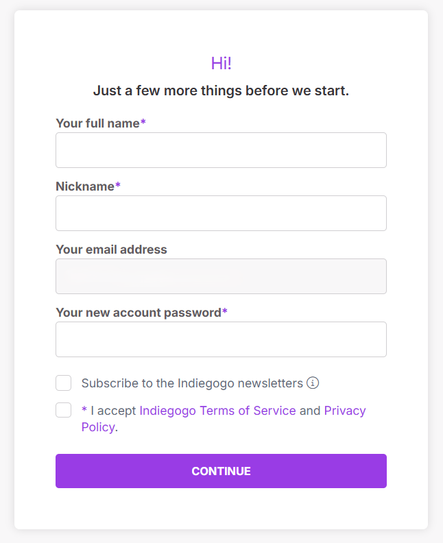 To sign up to Indiegogo, click here. You’ll be asked to enter your email. Type your email address and click "Continue". We’ll send you an activation link with further instructions. If you don’t get the email within a few minutes, check your spam folder. You should get this message with an activation link. If you didn't get the email, you have to repeat all these steps. The only way to create an account is by link.