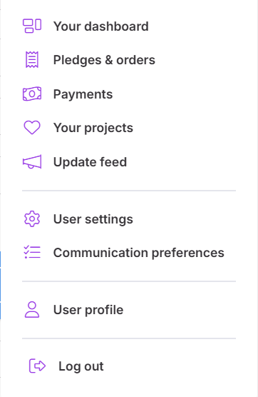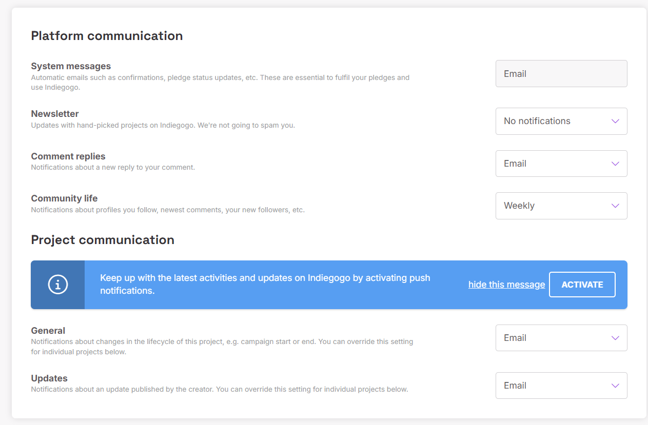 In "Communication preferences" in the account menu, you can define the subscription settings of email notifications for each project and creator. You can choose between push/email/both or no notification settings.