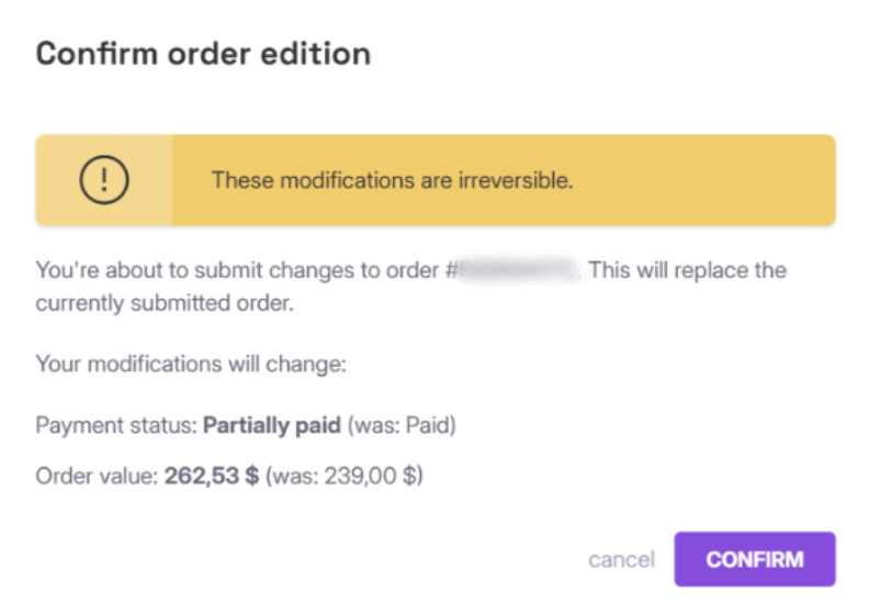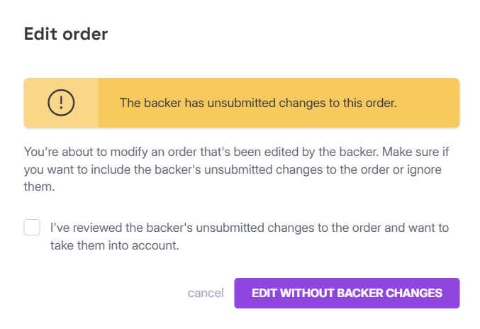 If a backer makes changes to the order but has not yet submitted them (e.g., has new, unpaid items in the cart), you will see the proper information when editing the order. You can decide whether you want to take the changes into consideration when editing the order or not. You can also view the edited order before making any changes. This is useful when you want the backer to make changes to the order that you will only accept later: