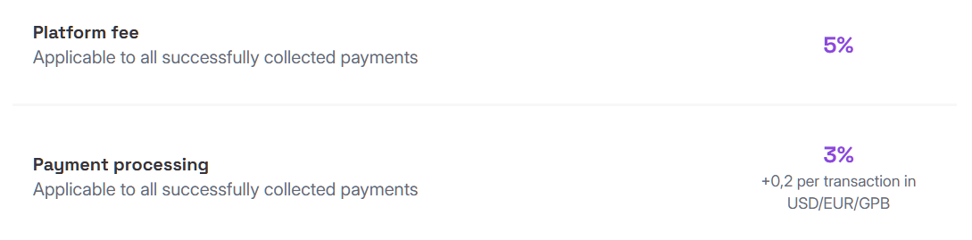 Payment processing: A fixed fee in the project currency plus 0.2 (e.g., $0.2 when $ is the project currency) applies to every transaction.