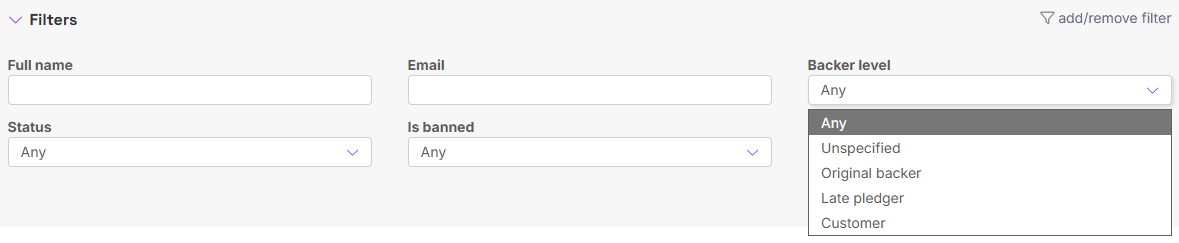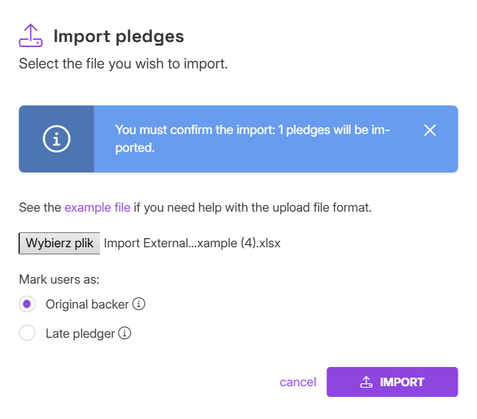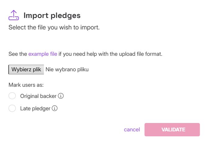 When importing pledges, you can mark backers as "Original backer", meaning that these are users imported from an external crowdfunding platform. Marking them as "Late pledger" means you want to include them in the same group as rest of late pledgers that will come to your project organically. You can later filter them easily in Users->User list: