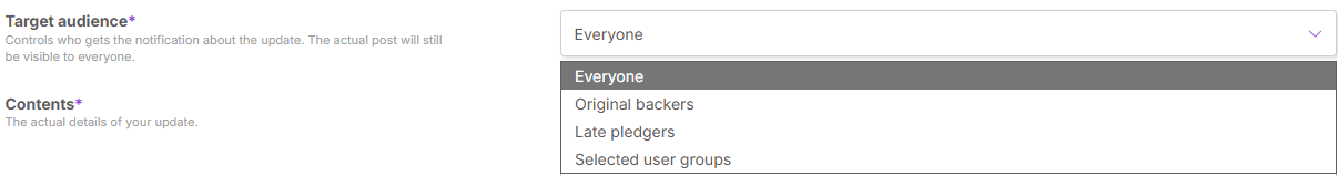 NOTE: We recommend leaving the "Default" user group for late backers, as this is where anyone who organically comes to your page and pledges is placed by the system. Creating a separate group for original backers makes it easier to manage all users later. More details about creating user groups can be found here.