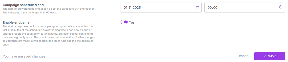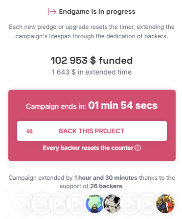 Endgame is a feature designed to extend the final moments of a crowdfunding campaign that is still actively receiving pledges, even as the original countdown ends. It gives both backers and creators a little more time, helping to prevent interested supporters from missing out.