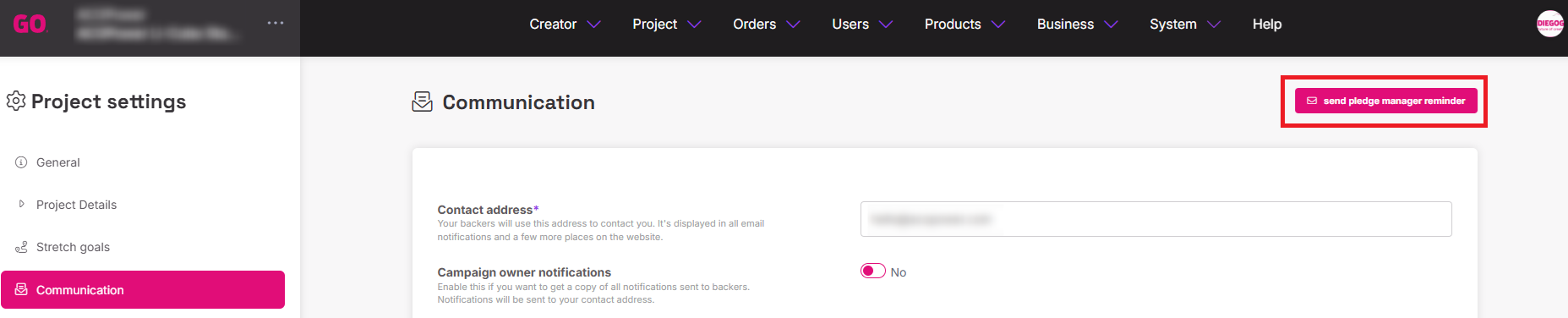 You can send email reminders about unfinished pledges to your backers. If you want to use this option, go to Project settings and select Communication, where you’ll find a button in the top right corner.