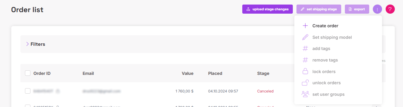 Once your crowdfunding campaign ends, you can create new orders for your backers from scratch. To do this, go to Orders -> Order list, click the three-dot button, and choose "Create order":