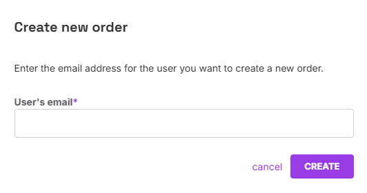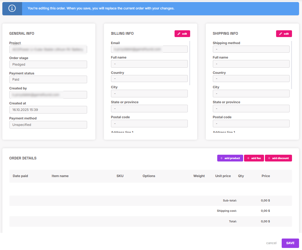 You can create a new order by adding the backer's email. You will be transferred to the order details view, where you can add products and make other changes: