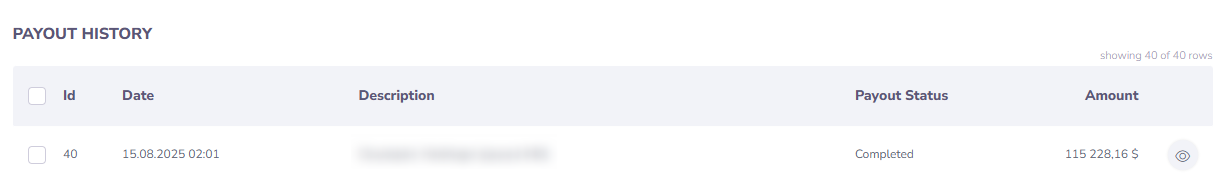 You can easily delve into the details of transactions bundled within a single payout. To do so, select the eye icon next to a payout (“View Details”):