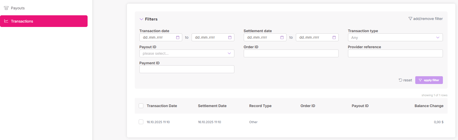 To browse the list of all transactions, go to "Transactions" on the menu list. Use filters to narrow down the search: