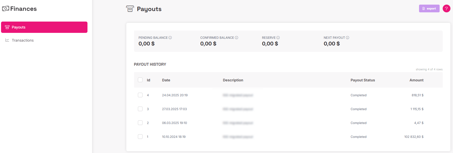 - Payout history - Past payouts, along with the lists of all transactions bundled within a single transfer to your bank account.