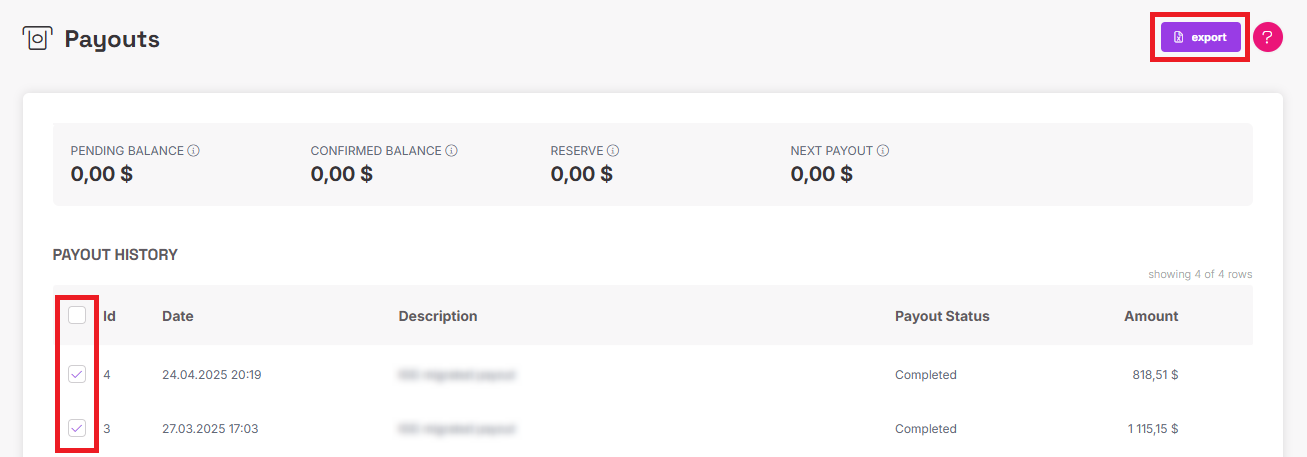 All the records can be exported as an Excel file for convenient processing. Select the transaction(s) and click the "Export" button at the top of the page: