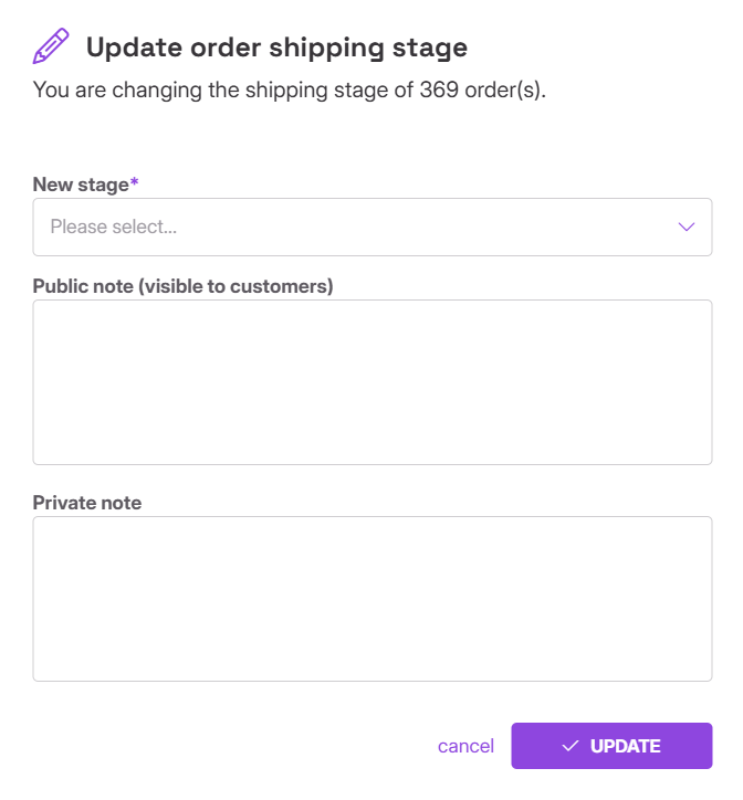 Click the list under "New stage" to choose the new stage for the orders. You can add a public note for your backers (for example, "your order has been shipped") and a private note for your eyes only. Click "Update" to save the changes.