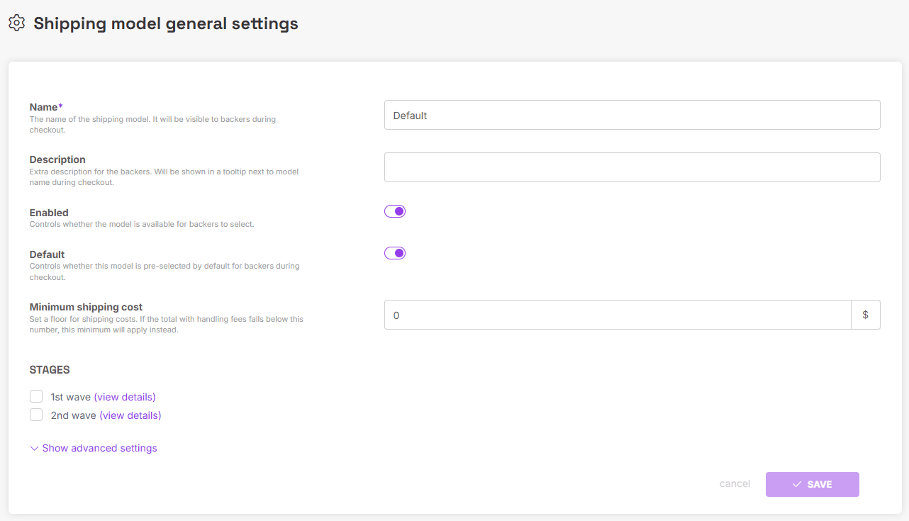 Ready for Shipping | Setting the status of a wave (e.g., Wave 1) to "Ready for shipping" causes the linked shipping model to disappear for any new pledgers and backers who have not yet finished their pledge; for example, if there are two models - split and single shipment - and the former has both waves linked to it and the latter only Wave 2, then after changing the status, only the single shipment model will remain available. |